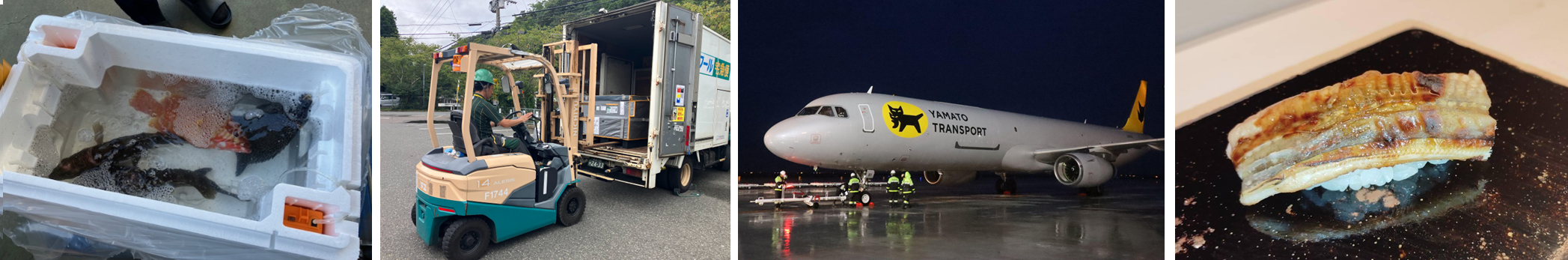 北九州空港から羽田空港へ、深夜のフレイター定期便を活用し、長崎県対馬市から東京都千代田区の飲食店に、穴子・クエ・アカハタ・キジハタ・オコゼなどを生きたまま輸送しています。ダイケーさまは、これまで活魚を小ロットで輸送することが難しい状況でしたが、深夜のフレイター定期便を活用することで、対馬で夕方にお預かりし、その翌朝に東京都内の店舗まで、生きたままお届けできるようになりました。