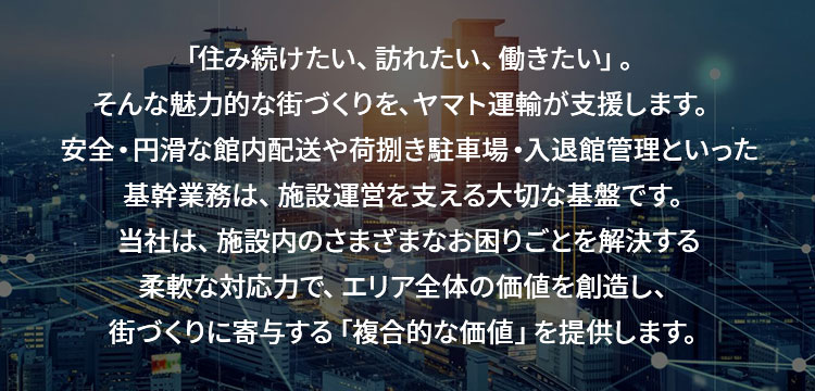 安全でスムーズな館内配送や荷捌き駐車場の運営はもちろん、「こんなことまで頼めるのか」といった現場ならではのご要望にも柔軟に対応。施設で働く人、訪れる人、すべての方にとって快適な環境を創り出し、「住み続けたい、訪れたい、働きたい」街づくりをヤマト運輸が支援します。