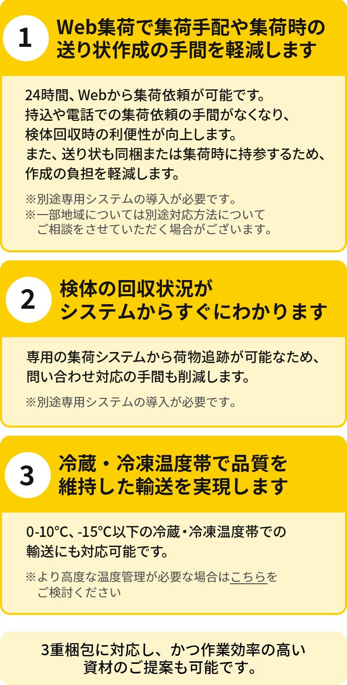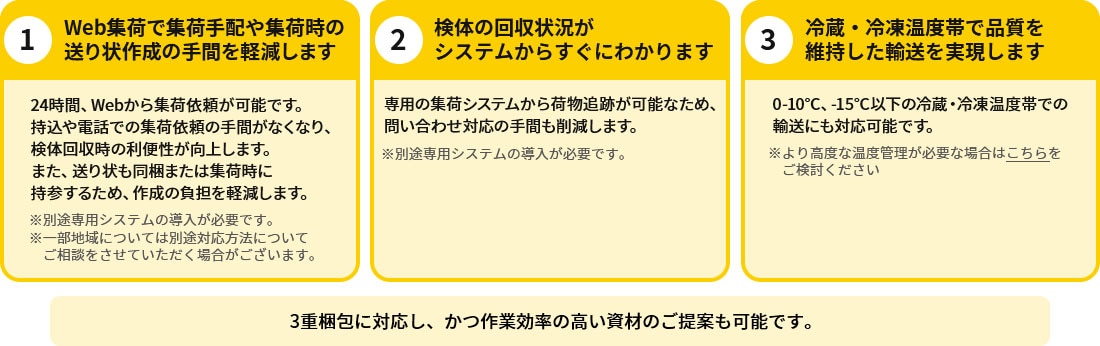 ヤマト運輸では以下3つの要件を満たした検体に限り、輸送可能です。