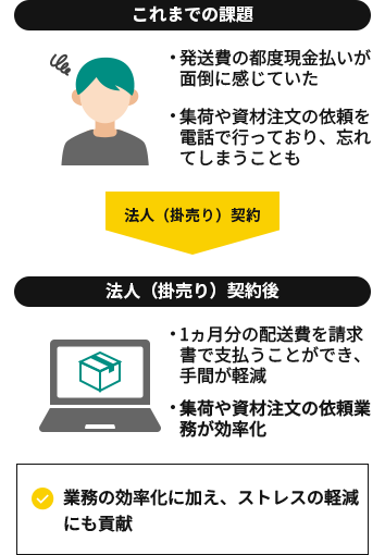 そこでヤマト運輸に相談させていただきました。毎回の発送費と合わせて資材費も一括でキャッシュレスでの支払いが可能なため、事務作業がよりスムーズになるとの説明を受け、法人(掛売り)契約に申し込みました。