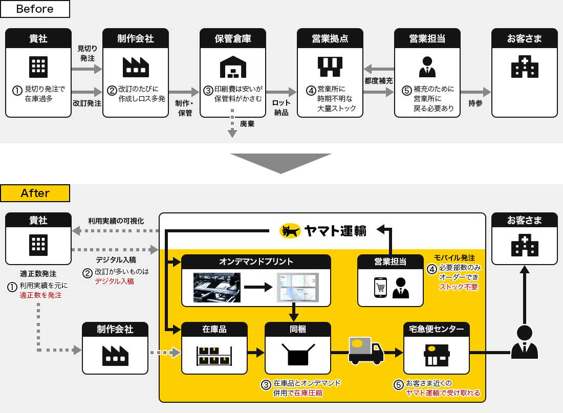 利用頻度の少ない販促物をヤマト運輸倉庫内のオンデマンドプリンタで印刷することで、在庫保管コストを削減しました。また営業担当がモバイル発注した販促物をヤマト運輸営業所で受け取ることが可能になったため、直行直帰の頻度が向上。事務所への立ち寄りに要していた移動時間を削減し、営業実務へより多くの時間を充てられるようになりました。