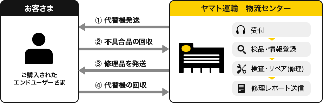 ヤマト運輸のネットワークを活用することにより、代替品の発送や修理品の返送を迅速に行います。