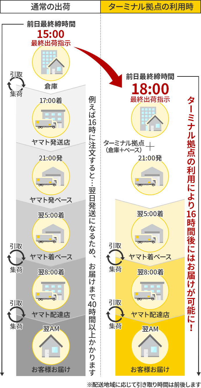 発送店を経由する必要がなくなるため、道路事情による集荷遅延等の影響が低減します。